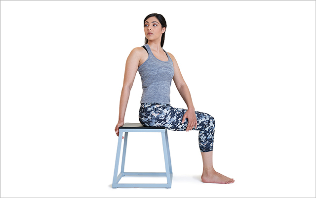 左手を右膝の外側に置き、右手を椅子の背もたれまたは後ろに持っていく。