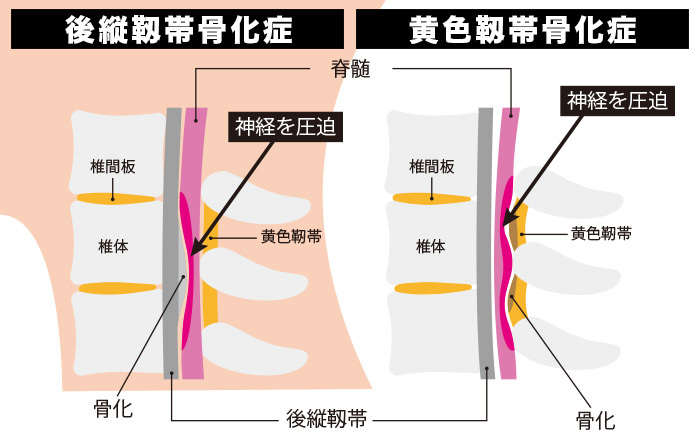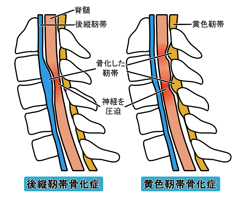 この病気は、脊椎の後縦靭帯が骨化することで神経を圧迫し、