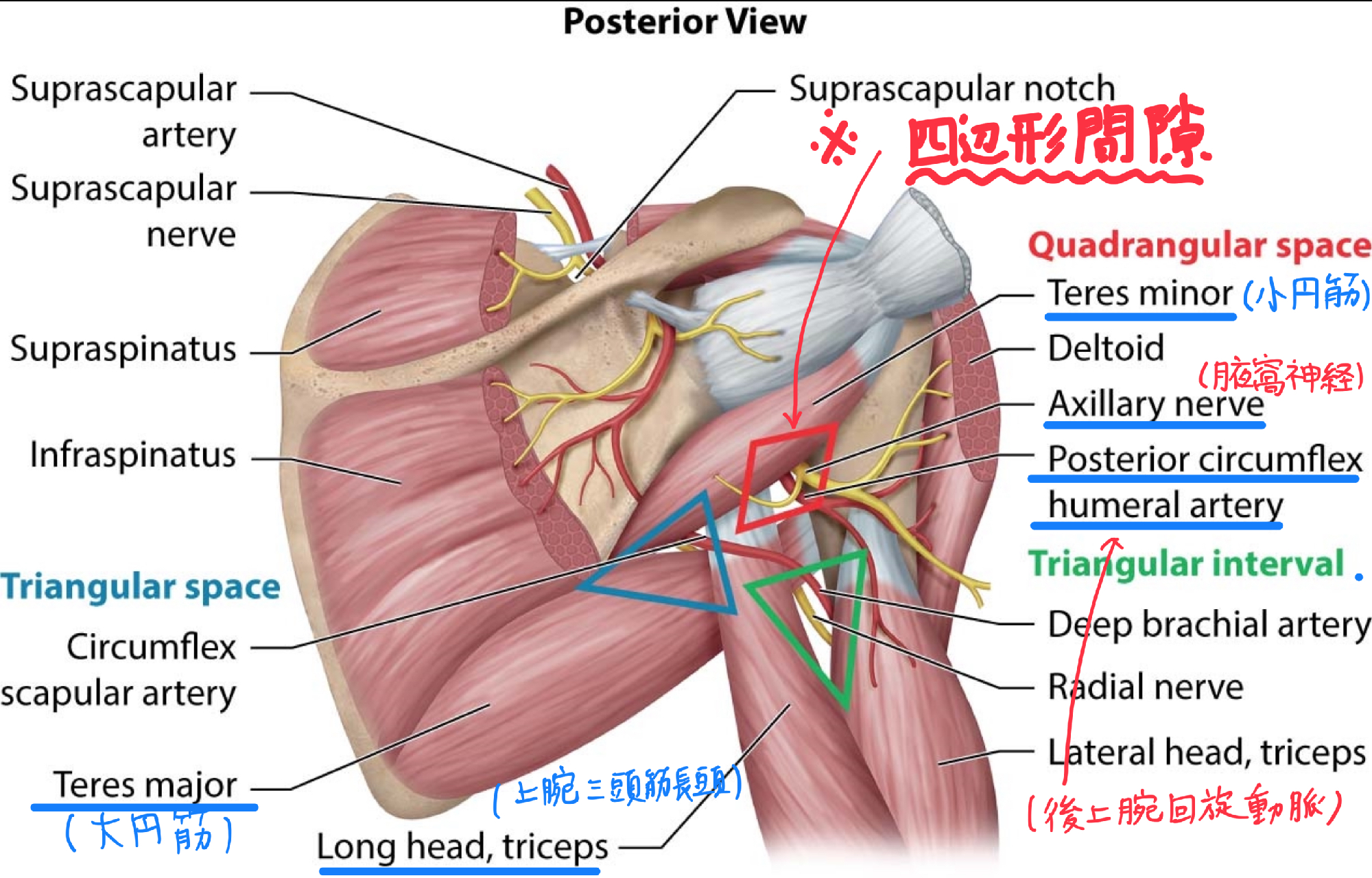 この間隙を通って腋窩神経と後上腕回旋動脈が走行しており、