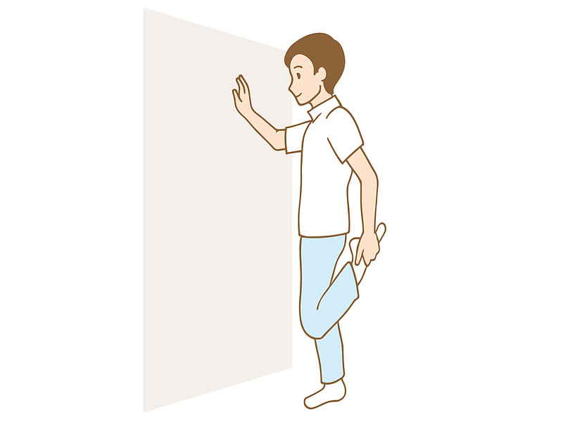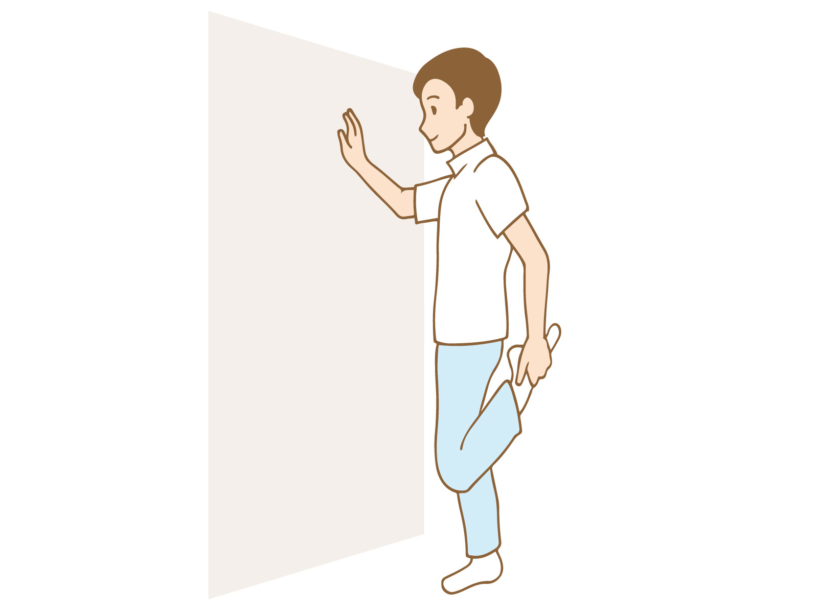 立位で片手で壁や椅子を支え、反対の手で同側の足首を持つ。