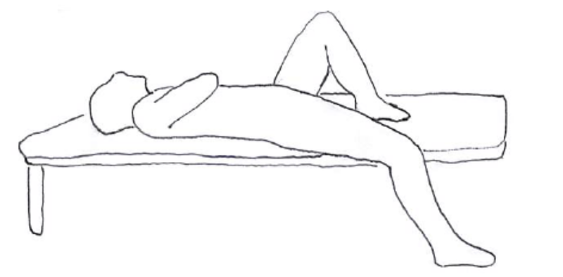 ベッドやテーブルの端に仰向けに寝て、片方の膝を胸に引き寄せる。