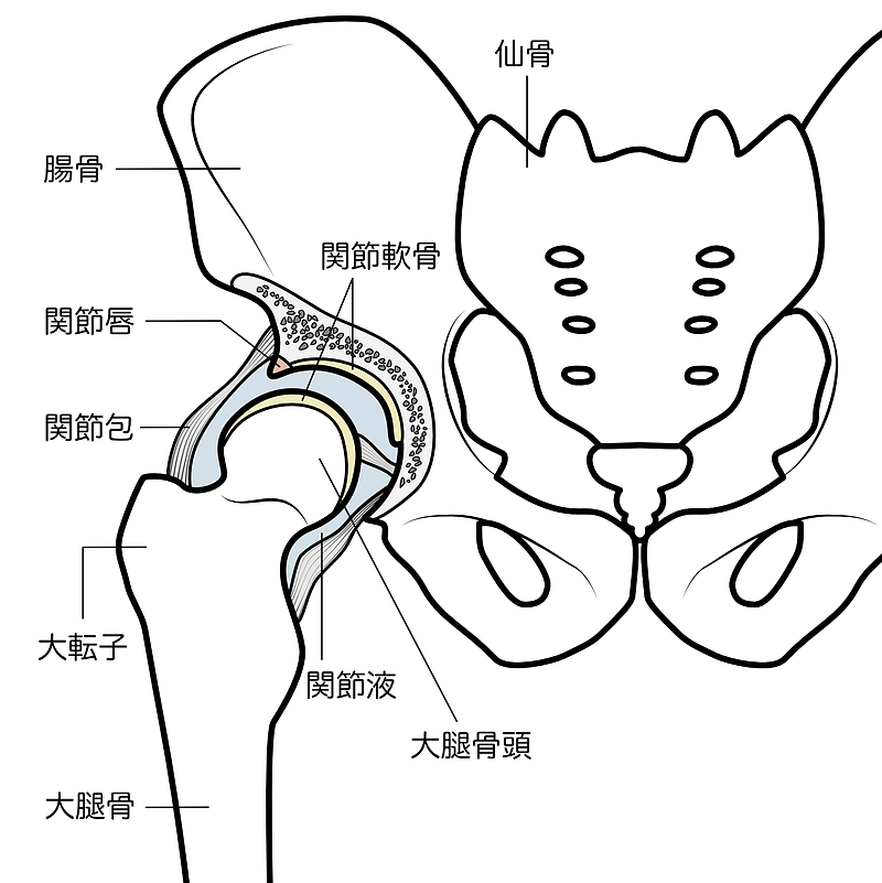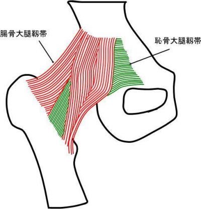 位置: 股関節を包む繊維性組織とその内部の滑膜、腸骨大腿靭帯、坐骨大腿靭帯など。
