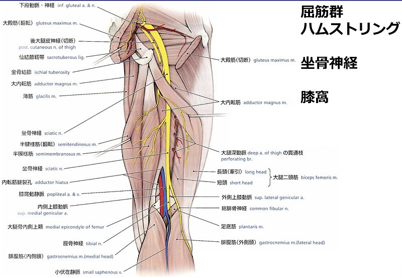 位置: 半膜様筋、半腱様筋、大腿二頭筋長頭、大腿後面に位置。
