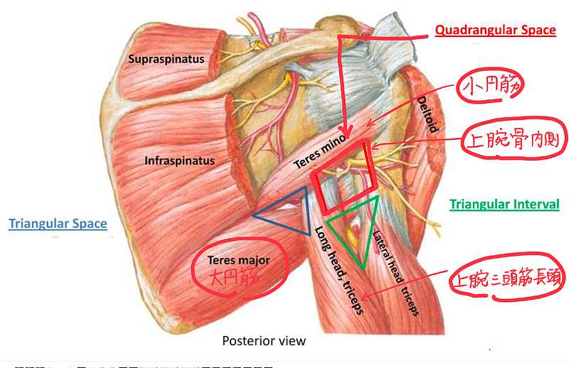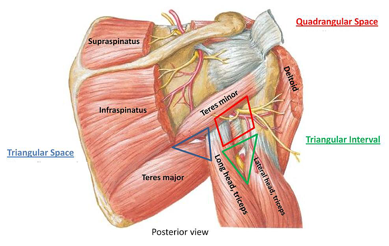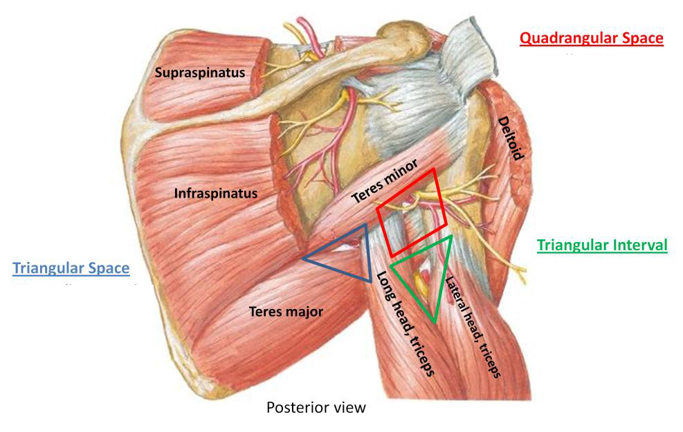 四辺形間隙(QLS)は、大円筋、小円筋、上腕三頭筋長頭腱、