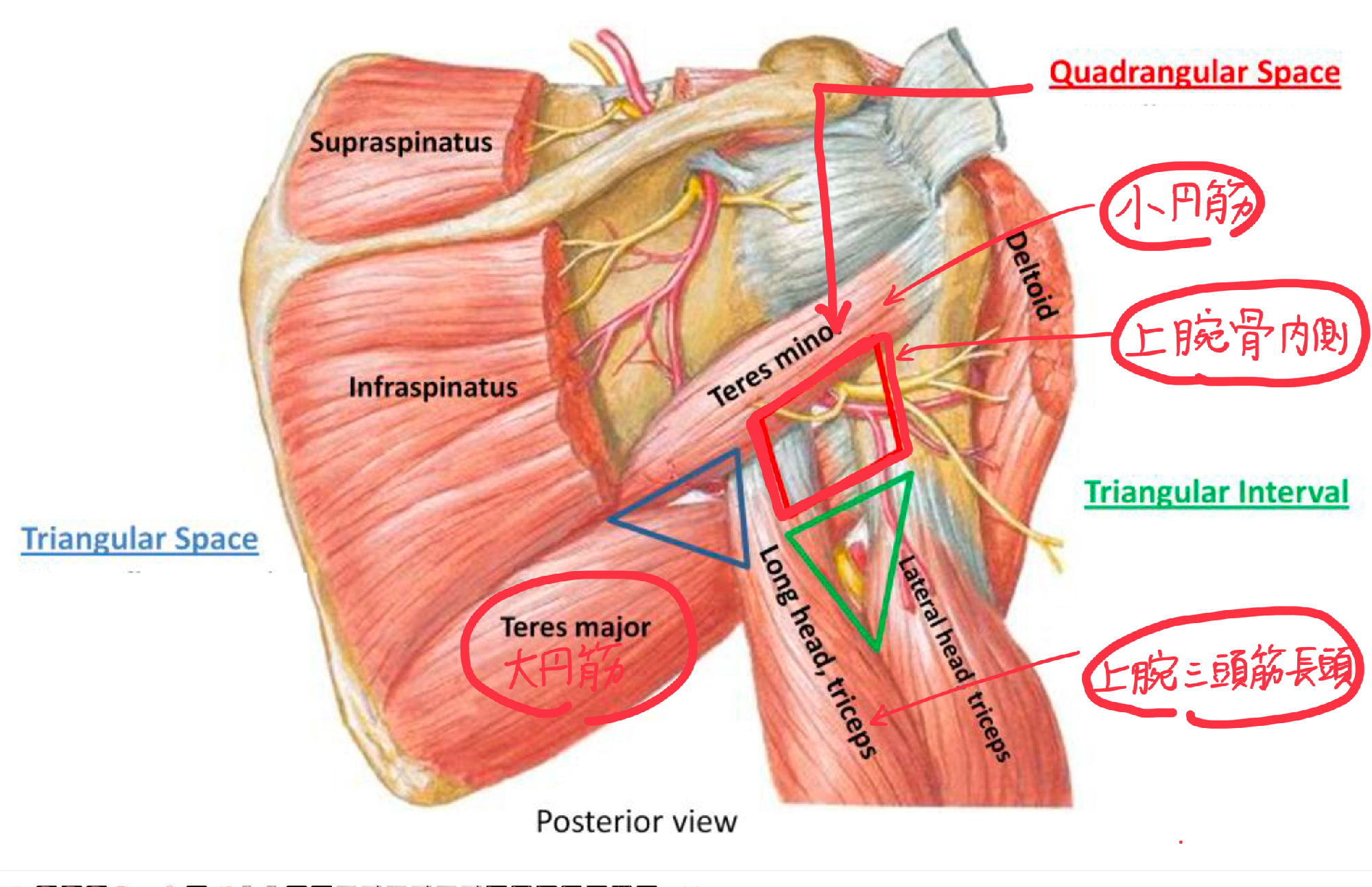 上腕骨内側部で囲まれた空間で、腋窩神経や後上腕回旋動脈が走行。