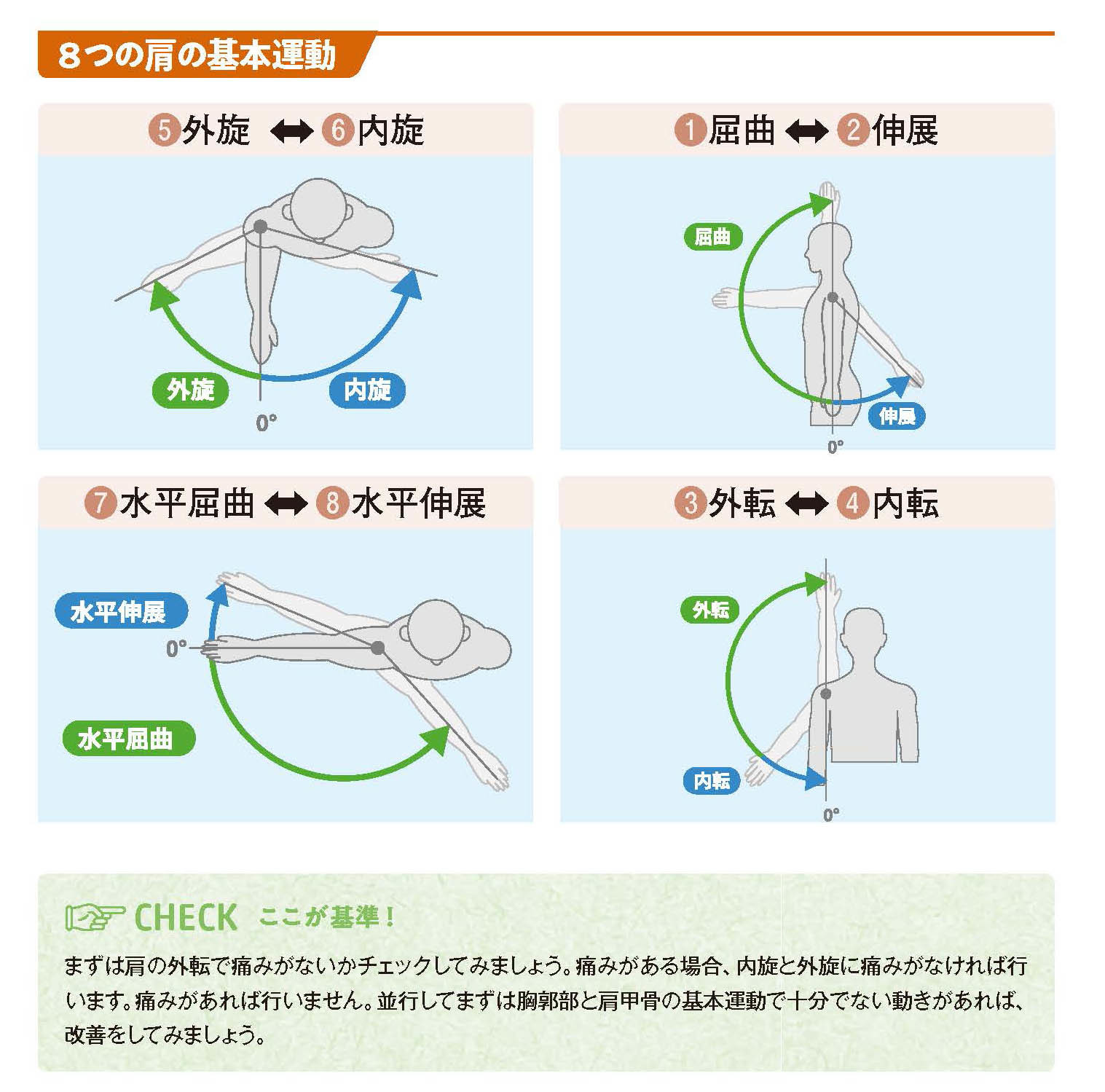 必要な可動域は屈曲(肩を前から上げる動き)・外転130°(肩を外から上げる動き。