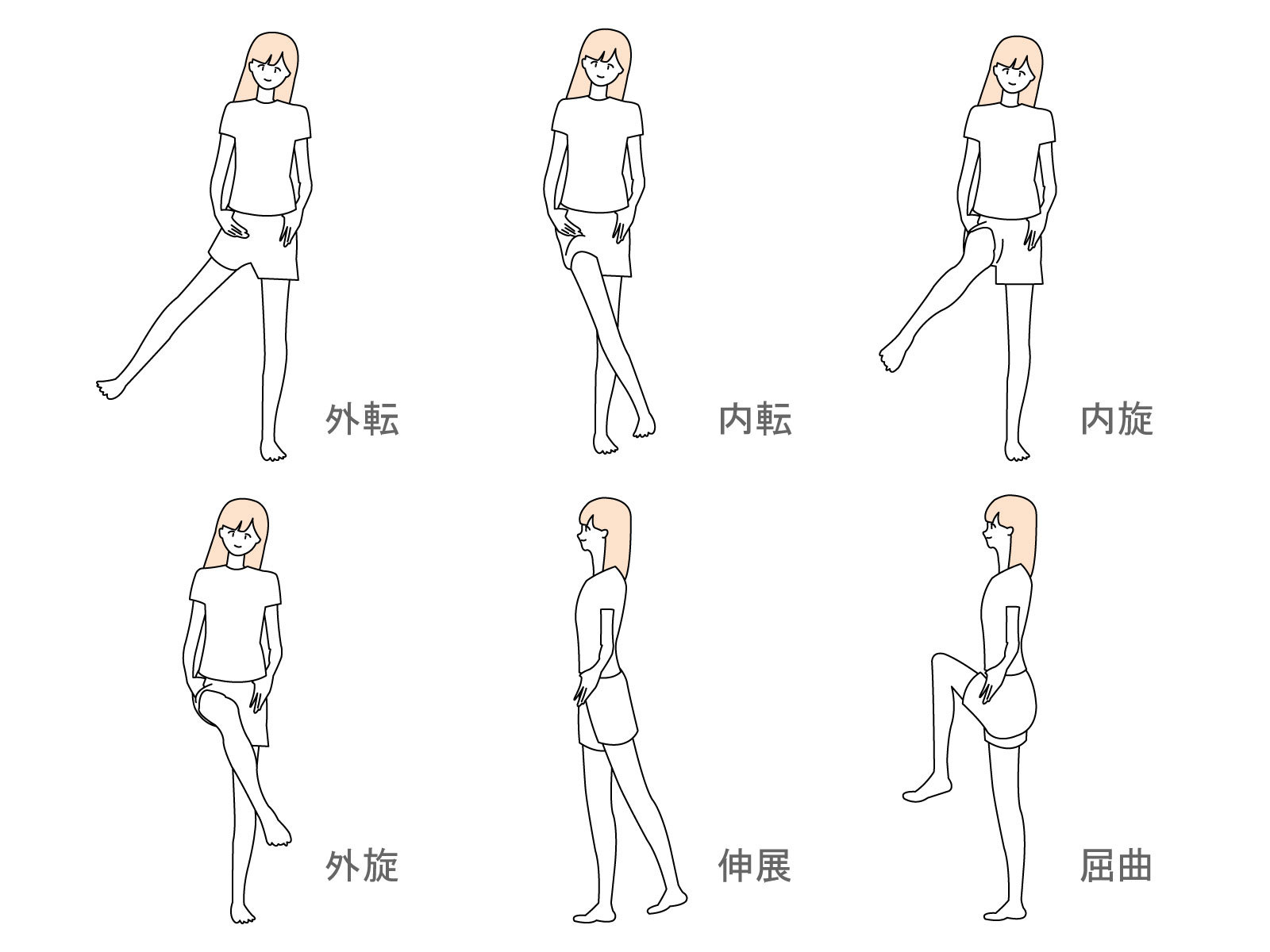 屈曲(膝を胸に近づける)、伸展、外転、内転、内外旋といった