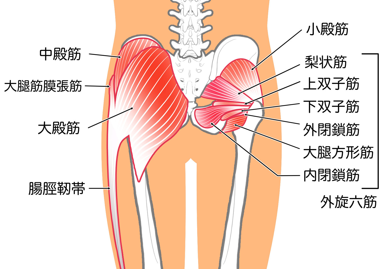 大殿筋、梨状筋、中殿筋・大内転筋、ハムストリングス、腸腰筋、