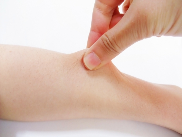 肘周辺の皮膚を軽く動かし、可動性の低下や緊張を特定。
