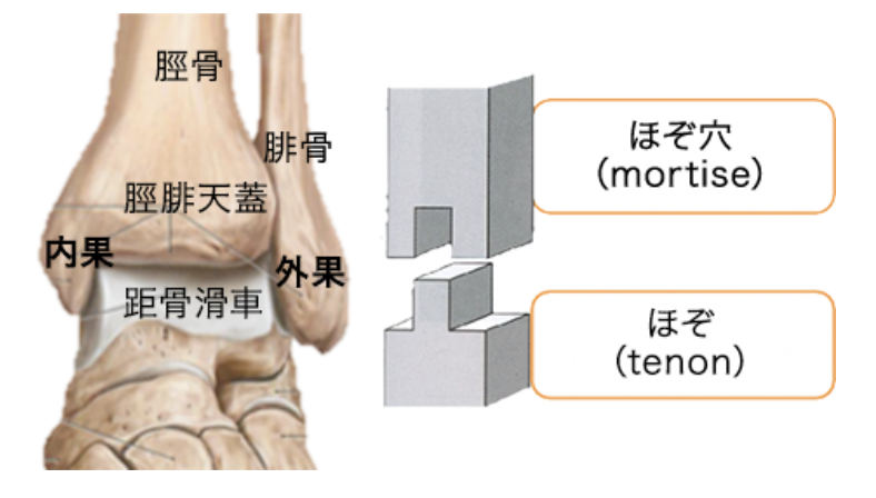 脛骨と腓骨が形成する関節窩(ほぞ穴)に、距骨がはまり込む構造によって、