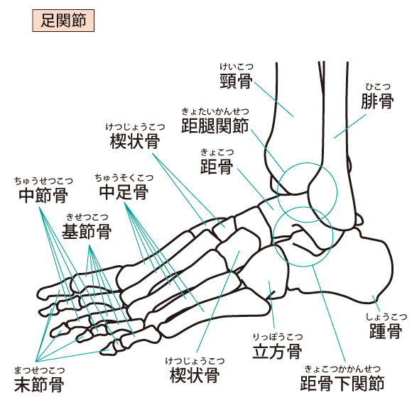 足関節の主な動きを担うのは、下腿(脛骨と腓骨)と足の距骨からなる「距腿関節」です。