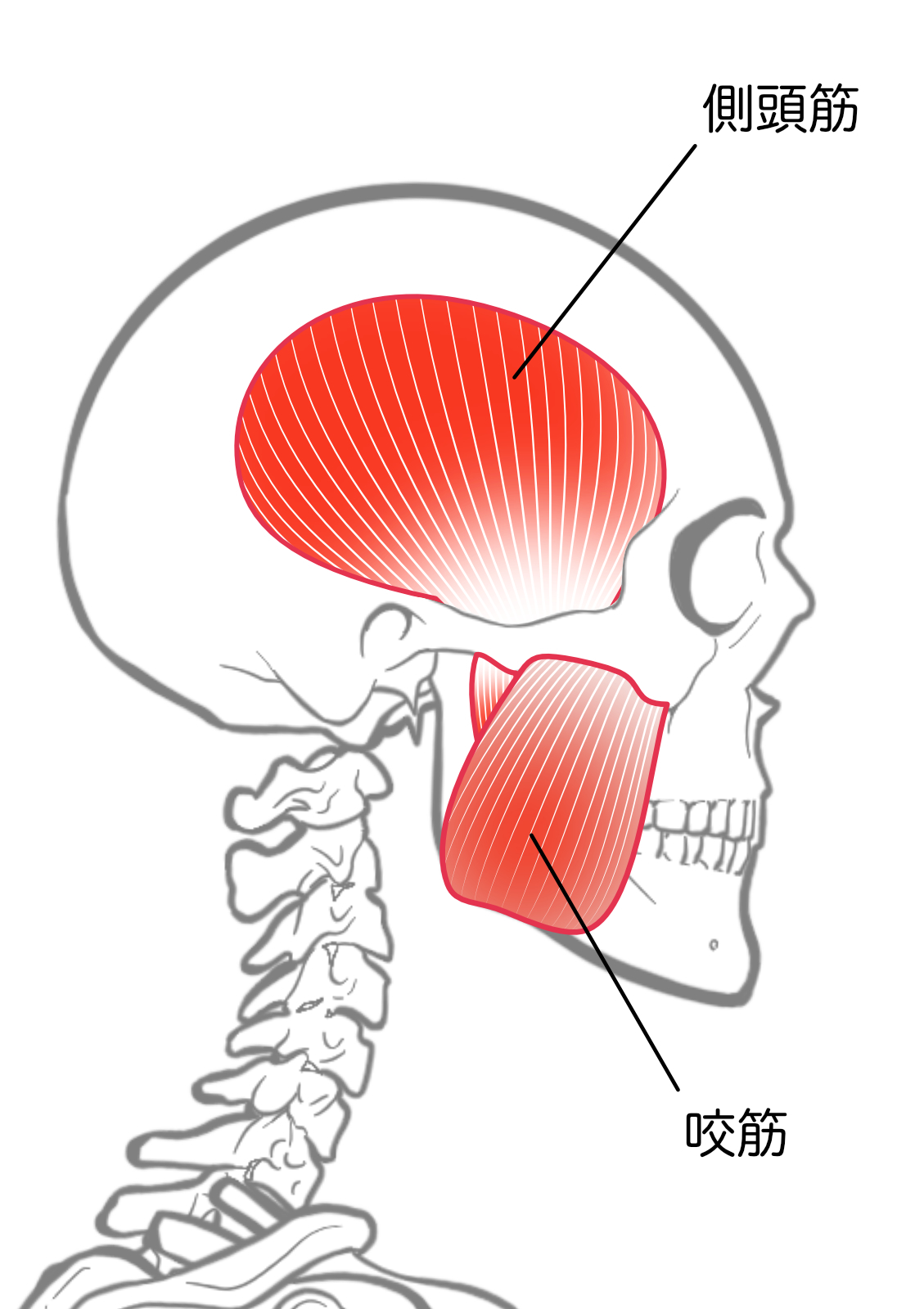 顎を動かす筋肉、特に頬にある「咬筋(こうきん)」や、こめかみにある