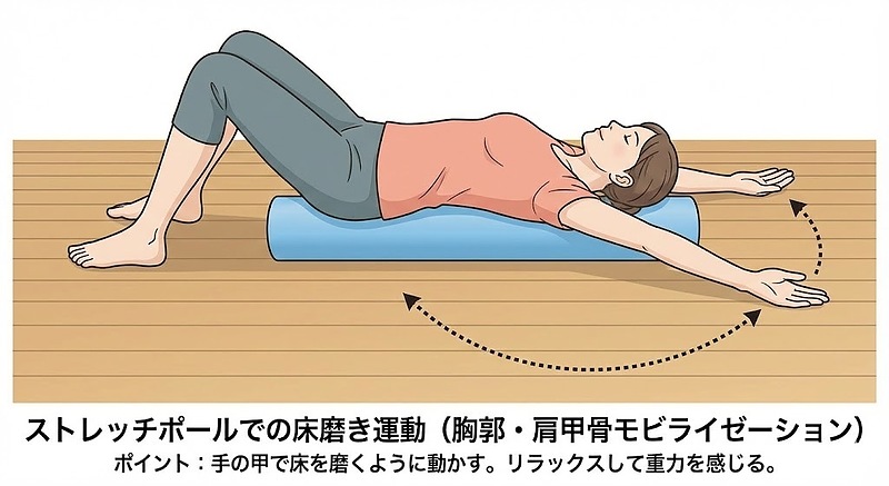 ストレッチポールなどを利用し、重力で胸を開きながら肩甲骨の大きな動きを引き出す。