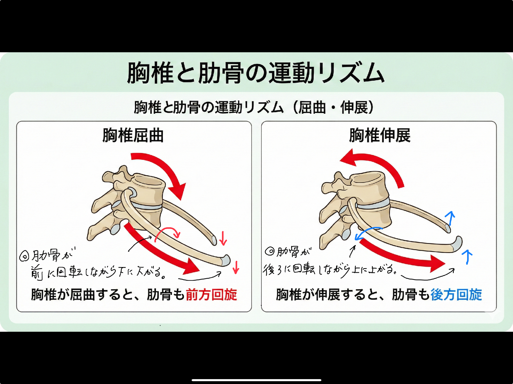 肩甲骨が後傾・外旋するためには、その下にある肋骨(特に上位肋骨)が連動して
