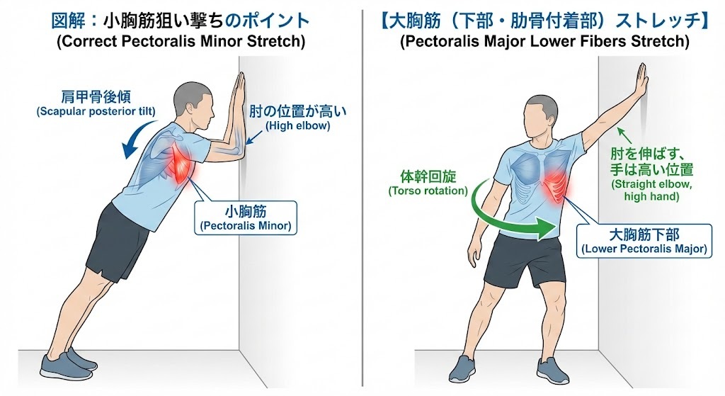 小胸筋を効率よく伸ばすには、大胸筋(特に鎖骨部・胸肋部)の影響を避け、