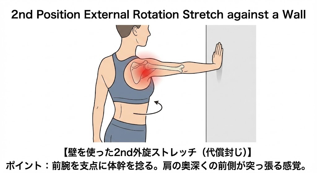 【壁を使った2nd外旋ストレッチ(代償封じ)】