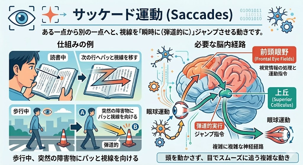 ある一点から別の一点へと、視線を「瞬時に(弾道的に)」ジャンプさせる動きです。