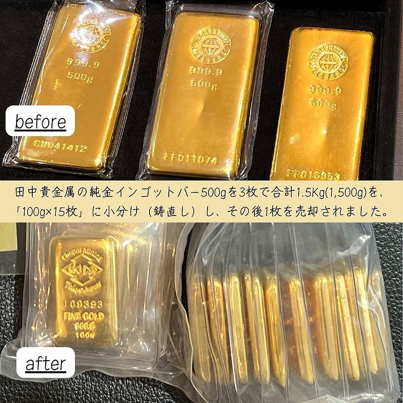 田中貴金属の純金インゴットバー500gを3枚で合計1.5Kg(1,500g)を、「100g×15枚」に小分け(鋳直し)しました。その後1枚を売却されました。