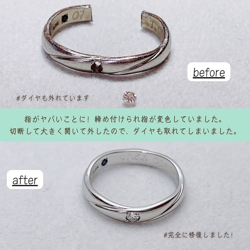・指輪が食い込んで、いつかはこうなると思っていました。外せるうちに外しておけば良かったです。とにかく修理できて助かりました。