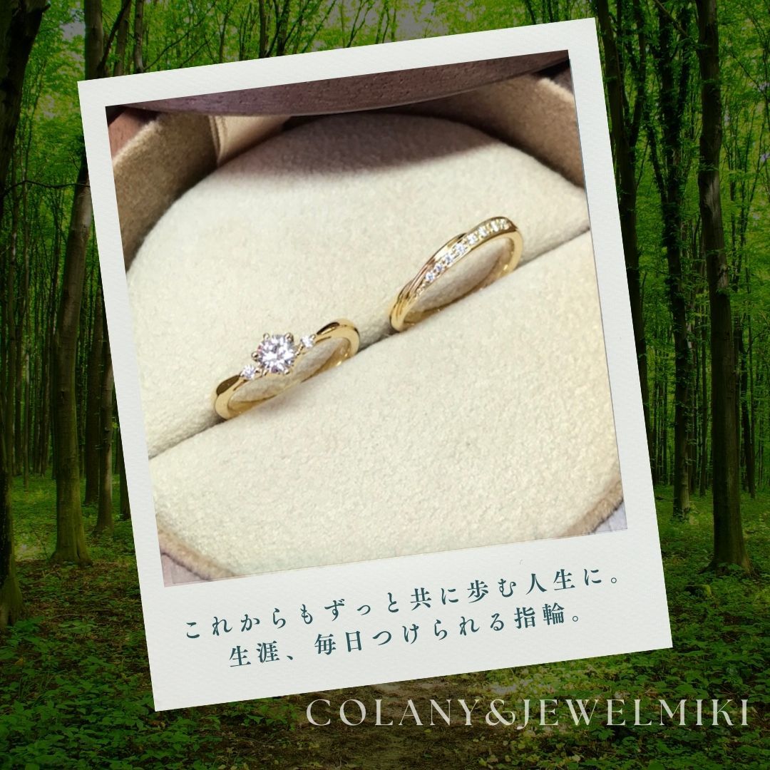 お二人で一緒に選んだゴールドの結婚指輪はブライダルリングブランド「COLANY(コラニー)」です。