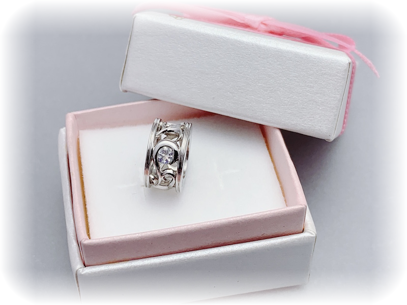 6月が誕生日ということで6月誕生石のムーンストーンを、透かしの幅広デザイン、Pt900でオーダーメイドさせて頂きました。