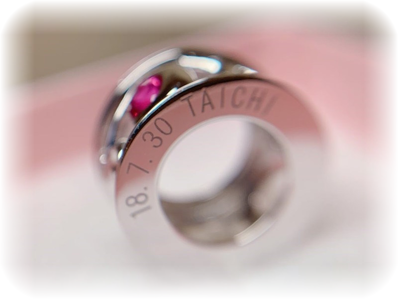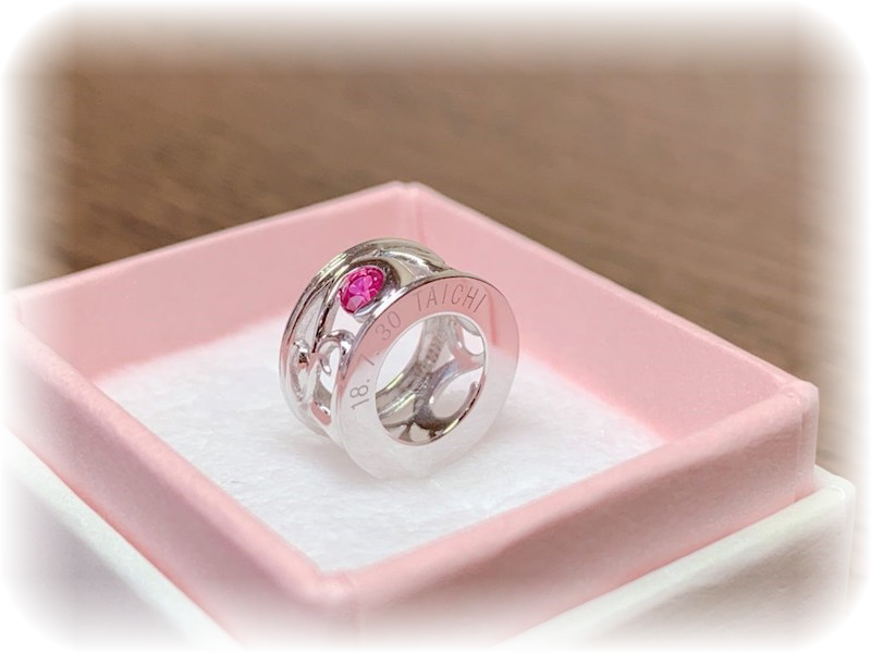 出来上がりをご覧になり、「小さくて可愛いですね。誕生日と名前もこんなにはっきりと刻印されていて、想像以上によかったわ。ありがとうございました」と、喜んで頂きました。