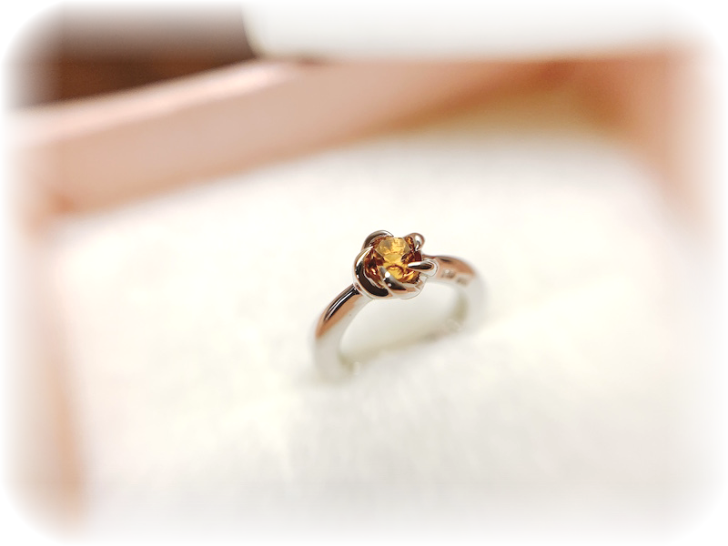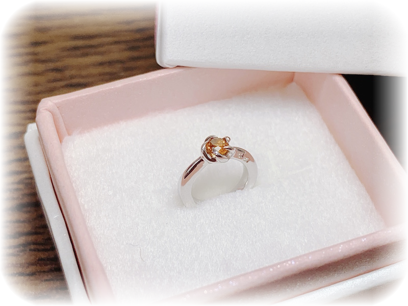 11月が誕生日ということで11月誕生石のシトリントパーズを、シンプルなリングデザイン、18金ホワイトゴールドでオーダーメイドとなりました。
