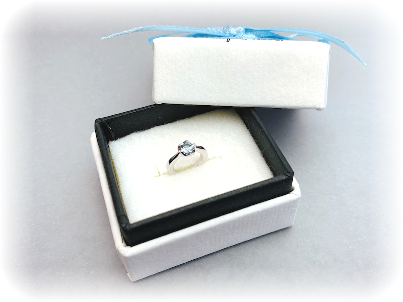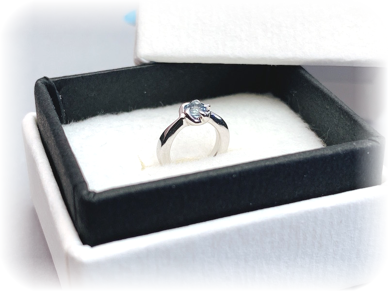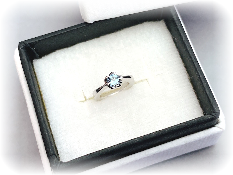プラチナが変色しなくてずっと愛用できるということを知って、とても喜んでおられました。3月が誕生日ということで3月誕生石のアクアマリンを、シンプルなリングデザイン、Pt900でオーダーメイドさせて頂きました。4週間ほどで完成しました。
