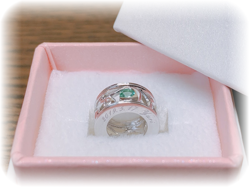 5月が誕生日ということで5月誕生石のエメラルドを、幅広で透かしデザイン、メンズでもレディースでもご愛用頂けるベビーリング、Pt900でオーダーメイドさせて頂きました。