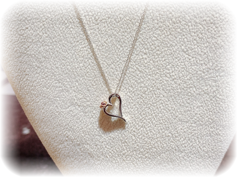 2月が誕生日ということで2月誕生石のアメジストを、可愛いハート&フラワーデザイン、Pt900とK18PGのコンビタイプでオーダーメイドさせて頂きました。ネックレスはプラチナ850ネックレスを一緒にオーダーされました。