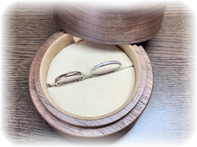 そして結婚指輪もエタニティデザインのモミジを選ばれました。メンズはシンプルに、レディースはハーフエタニティです。これにより婚約指輪のカサブランカとも綺麗に重ねづけが出来ます。