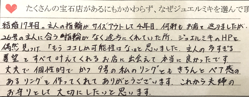 「結婚17年目。主人の指輪がサイズアウトして4年目。何軒もお店を廻りましたが、26号の主人に合う指輪がなく途方にくれていたところ、ジュエルミキのHPを偶然見つけ「もうここしか可能性はない」と思いました。主人の多すぎる要望をすべて叶えてくれるお店に出会えて本当に良かったです。丈夫で個性的でかつ9号の私のリングともきちんとペア感のあるリングを作ってくれてありがとうございます。これから夫婦のお守りとして、大切にしたいと思います。」