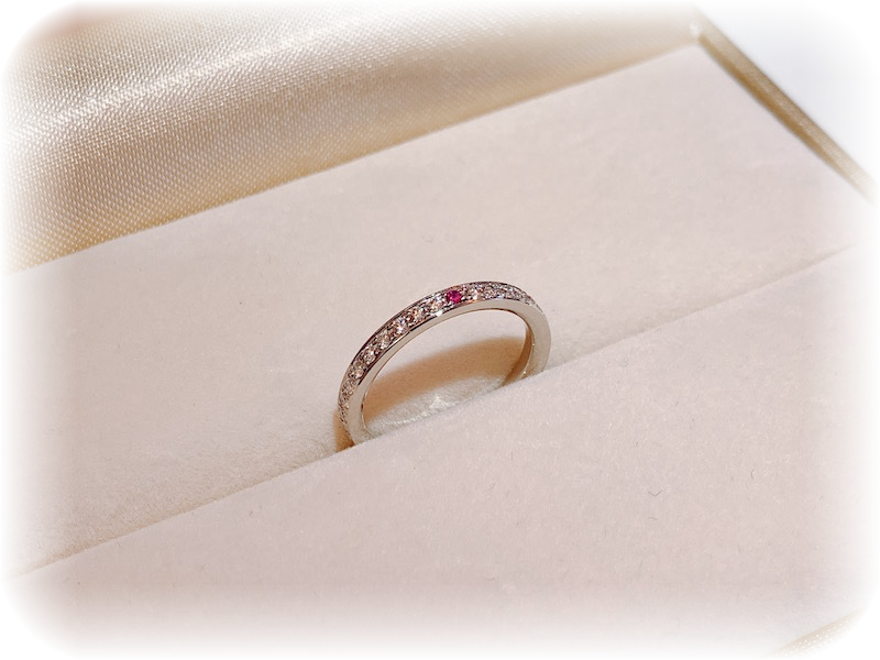 「エンゲージリングはフルエタニティをつくりたい、そしてそのフルエタニティリングの真ん中に、私の誕生石(誕生石は守護石と言われています)のルビーを留めて欲しい」とのご要望でした。