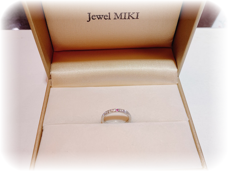 当店はフルエタニティのご注文、製作実績が豊富です。当店のフルエタニティの製法が鍛造製法なので耐久性もしっかりしていることや、誕生石ルビーの耐久性、硬度の説明をしながら納得して頂いてご成約となりました。