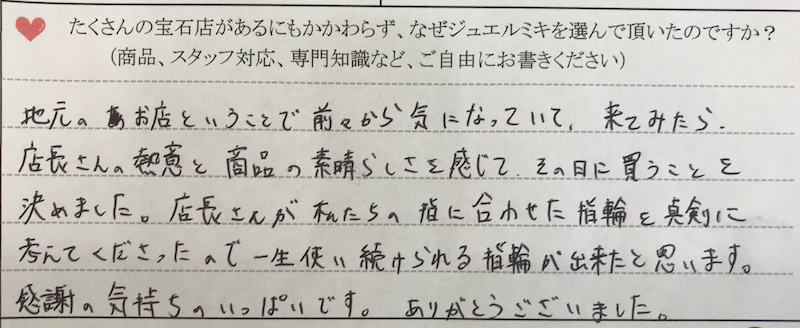 「地元のお店ということで、前から気になっていて、来てみたら店長さんの熱意と商品の素晴らしさを感じて、その日に買う事を決めました。店長さんが私たちの指に合わせた指輪を真剣に考えてくださったので、一生使い続けられる指輪が出来たと思います。感謝の気持ちでいっぱいです。ありがとうございました。」と、嬉しいコメントありがとうございます。