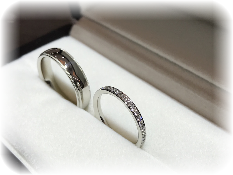 お二人とも鍛造製法で、メンズはPt950幅5mmの鏡面仕上げにミル打ち加工を施しました。レディースはPt950幅2mmの鏡面仕上げフルエタニティダイヤモンドリングです。