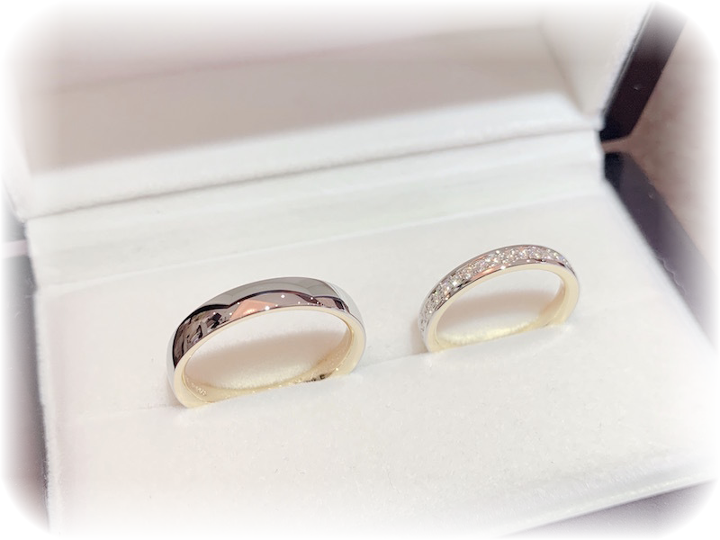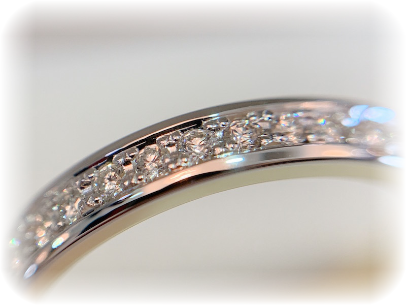 出来上がりをご覧になって「この幅のフルエタニティはどこにも売ってないデザインでしたね。細すぎるフルエタニティはいくつか見つけましたが、このくらいしっかりとした指輪の土台のフルエタニティが希望でした。しかもコンビのフルエタニティなんて見なかったです。丸みもつけてもらって本当に大満足です。本当に嬉しいです。ありがとうございました」と、喜んで頂きました。