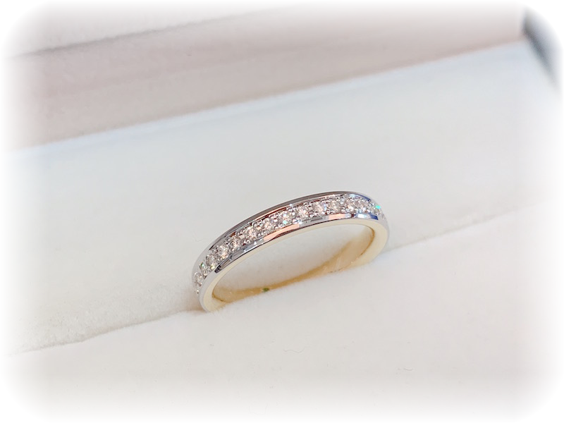 どこに行っても見つからなかった3mm幅プラチナと金のコンビのフルエタニティリングがジュエルミキさんにありました。