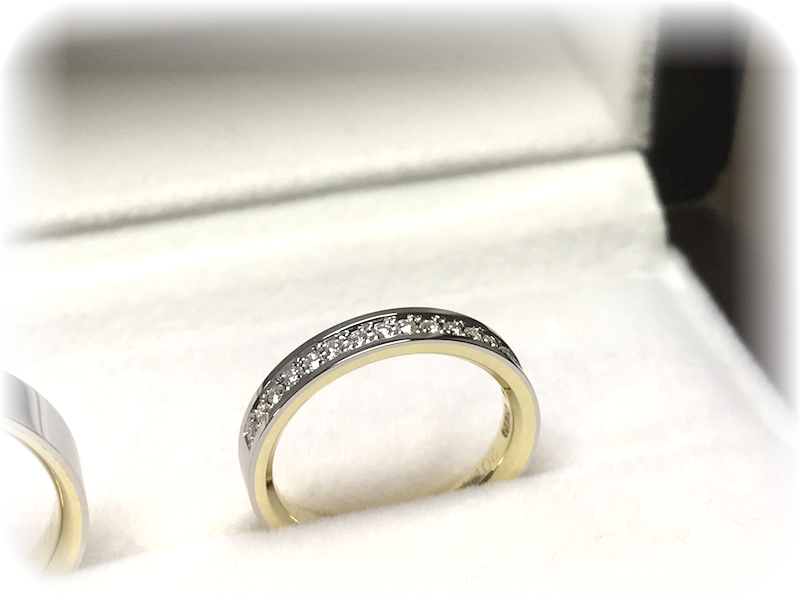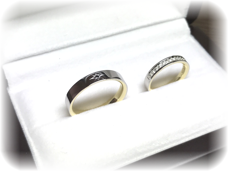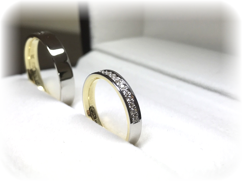 素材はプラチナとイエローゴールドのコンビ、表面のデザインもメンズはブラックダイヤモンドを、レディースはハーフエタニティデザインでオーダーメイド。