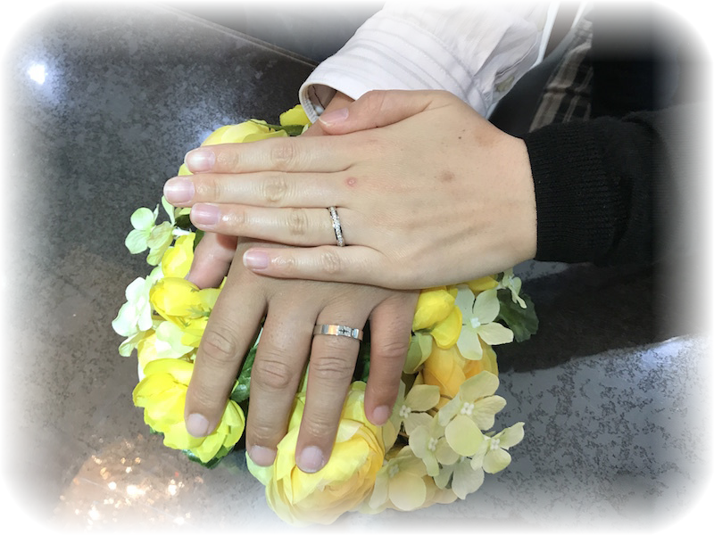 お二人の個性を発揮できたデザインの結婚指輪がオーダー出来たこと、内側の刻印などお二人のご要望をしっかりと形にできたこと、鍛造製法の丈夫さ、ハーフエタニティリングの美しさが決め手でした。