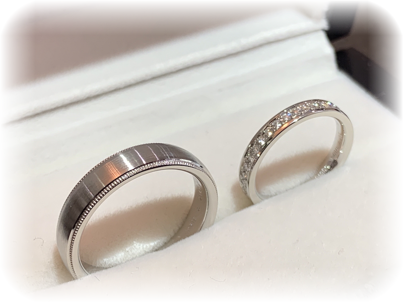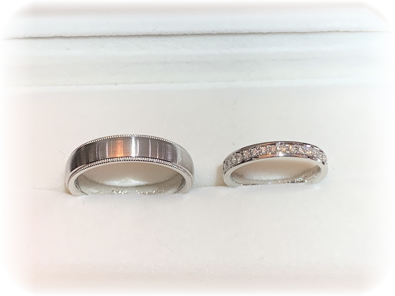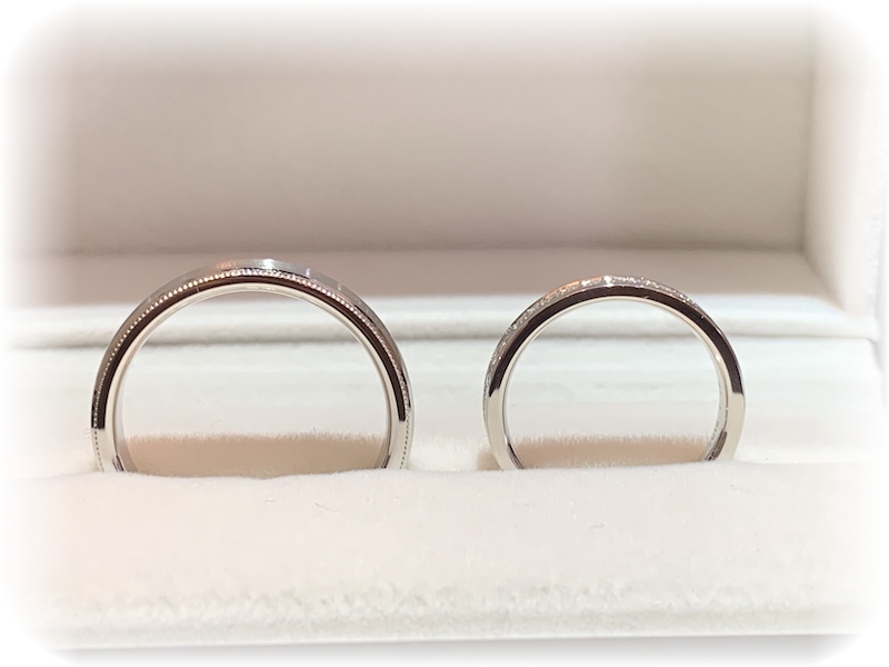 「ダイヤモンドが指輪をぐるりと囲っている指輪を結婚指輪にしたいと思っています。ネットで見ると細身が多いんですが、年齢的にも指の太さ的にもあまり細くない全周ダイヤモンドリングを探しています。以外とどこにもないんですよね」と、数件のショップを回られたお二人がご来店されました。