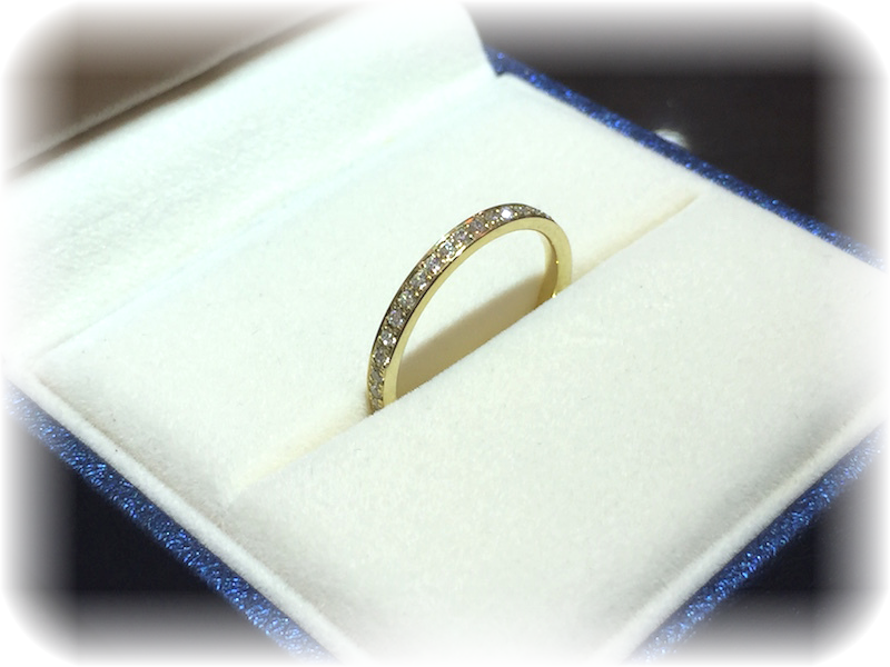出来上がりをご覧になって「1本1本オーダーメイドしてくれて、私のサイズにぴったりで作ってくれました。ダイヤモンドもとても綺麗だし、つけ心地もとてもいいし。重ねづけもぴったりで、期待以上のエタニティリングを購入することができました。ありがとうございました」と、喜んで頂きました。