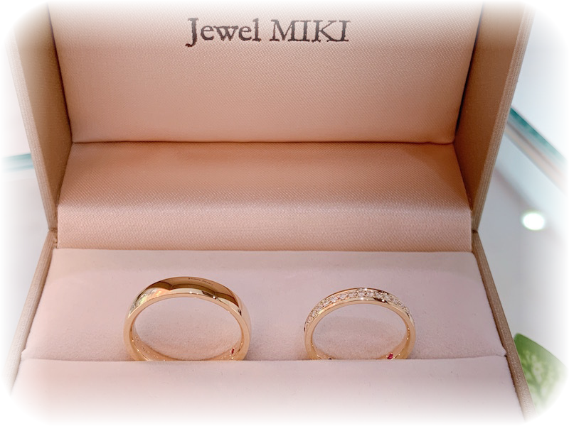 出来上がりをご覧になって「幅3mmにして正解です。私はあまり細い指輪よりもこのくらいの安心できる幅があった方が良かったので。それにしてもダイヤモンドも綺麗に輝いてるし、表面のピカピカ感もすごいですね。ジュエルミキさんにお願いして正解でした」と、喜んで頂きました。