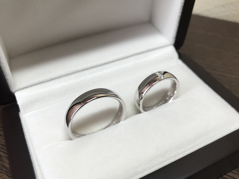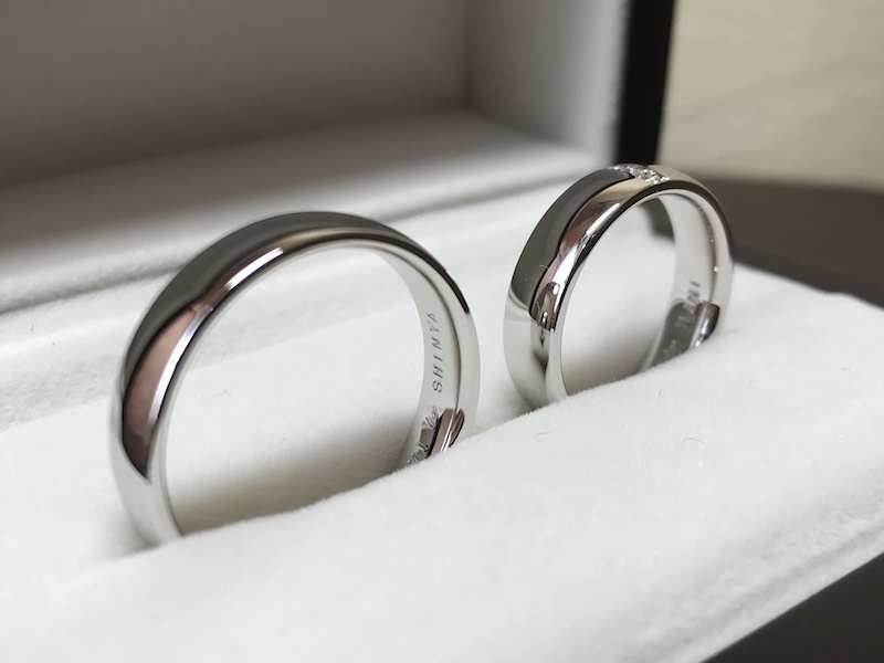 メンズはPt950幅5mmの鏡面仕上げ、レディースはPt950幅5mmの鏡面仕上げで、センターにダイヤモンドを3石あしらったデザインをオーダーメイドされました。