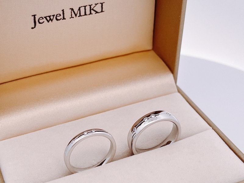 お二人とも出来上がりをご覧になって「自分達の希望であったことが全部叶えられた結婚指輪をオーダーメイドすることができてとても満足しています。ジュエルミキさんにも足を運んで結婚指輪を見てよかったです。おかげでずっとつけていたい指輪に巡り会えました。ありがとうございました」と、喜んで頂きました。