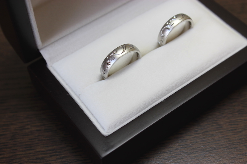 お二人とも出来上がりをご覧になって「うん、期待通りにかっこいい結婚指輪ができましたね。この指輪は写真映えするんじゃないですか!(笑)」と、喜んで頂きました。