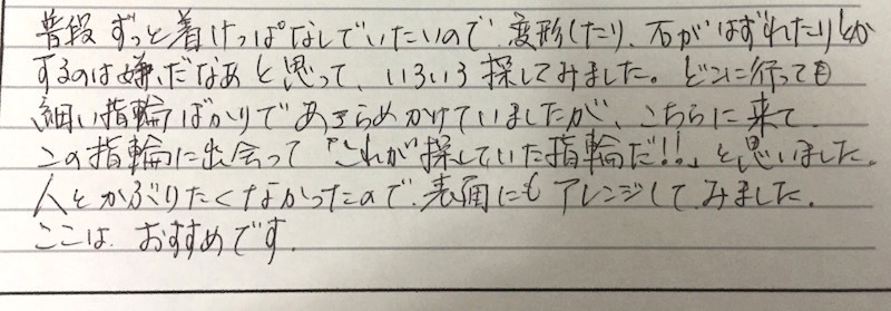 「普段ずっと着けっぱなしでいたいので、変形したり、石がはずれたりとかするのは嫌だなあと思っていろいろ探してみました。どこに行っても細い指輪ばかりであきらめかけていましたが、こちらに来てこの指輪に出会って「これが探していた指輪だ!」と思いました。人とかぶりたくなかったので表面にもアレンジしてみました。ここはおすすめです」