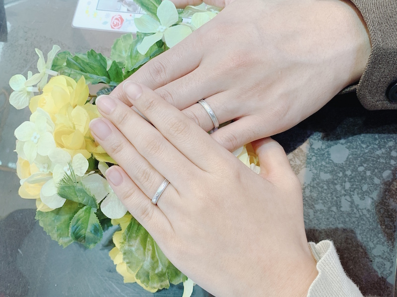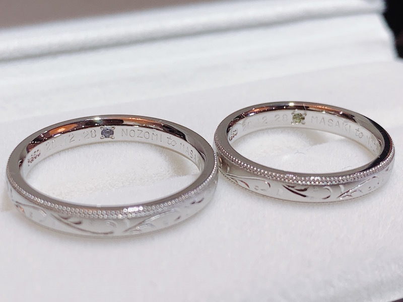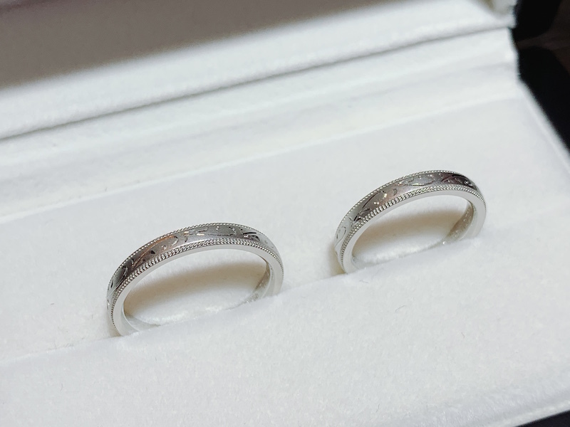 メンズはPt950幅3mm、サイズ14号つや消しマット加工&ミル打ち&手彫りで、レディースはPt950幅3mm、サイズ8.5号マット加工&ミル打ち&手彫りでオーダーメイドとなりました。