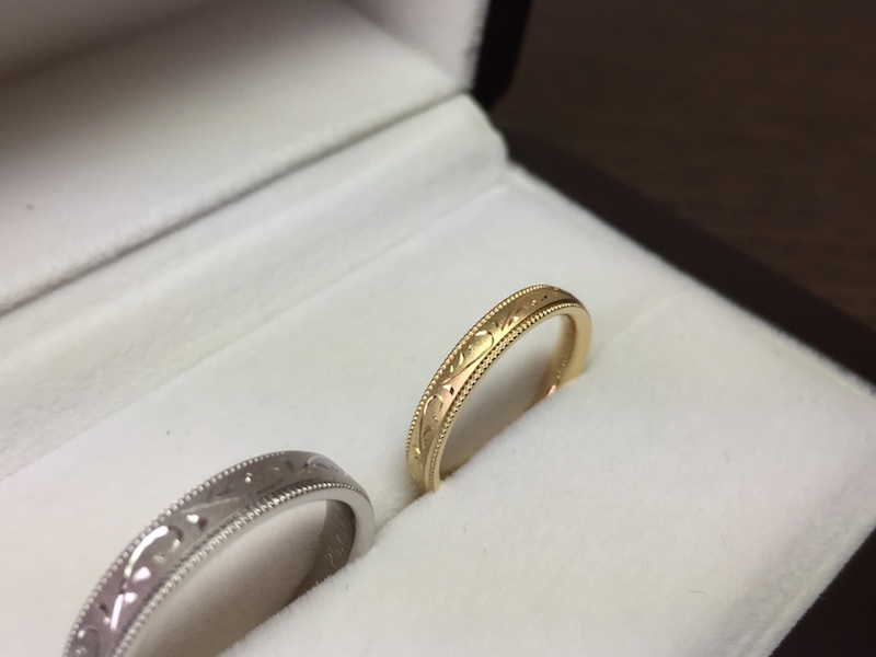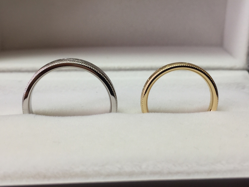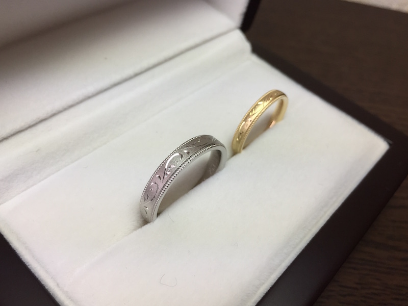 お二人とも出来上がりをご覧になって「つや消しと手彫りのコントラストがすごくかっこいいですね。お互いプラチナとゴールドの希望も叶ったのでとても嬉しいです」と、喜んで頂きました。