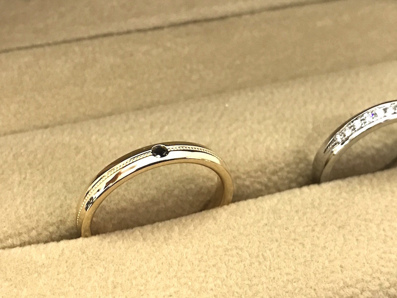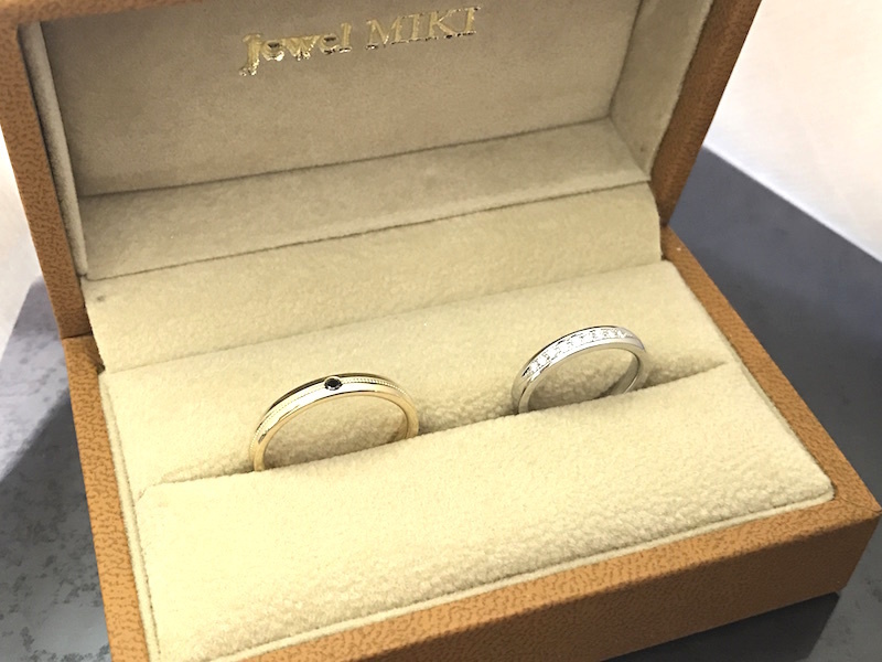 メンズはK18幅3mm、サイズ15号鏡面加工&センターライン&ブラックダイヤモンドで、レディースはPt950幅3mm、サイズ7号鏡面加工&ダイヤモンドグラデーションセッティングでオーダーメイドとなりました。
